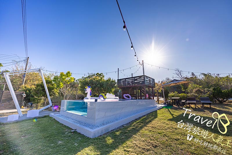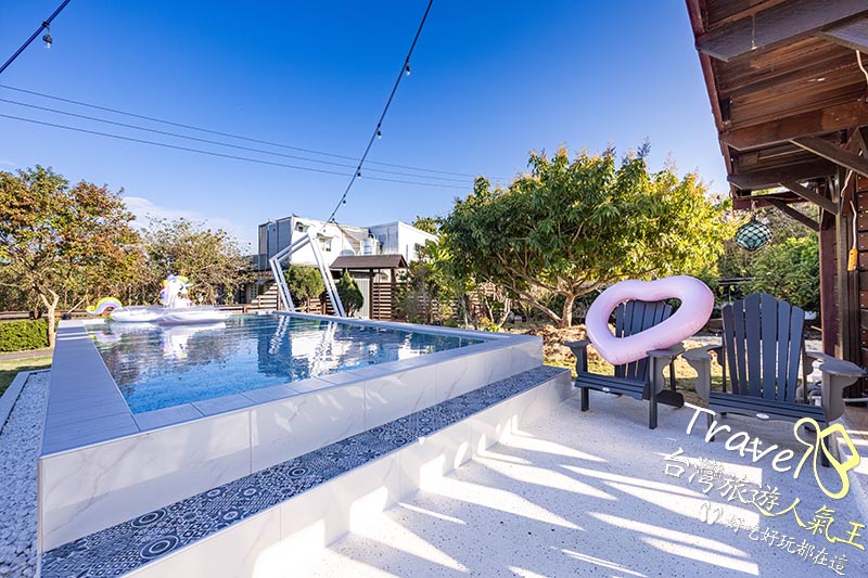 透明景觀泳池與池畔原木休閒椅,在陽光傾灑下呈現如地中海般的度假質感